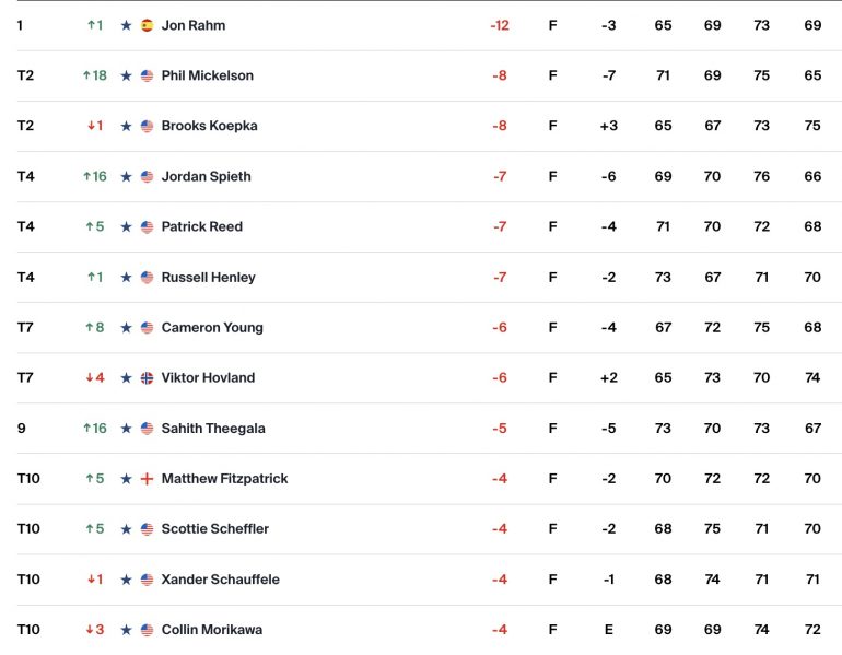 Pendant ce temps, Jordan Spieth, coutumier du fait, signait une charge héroïque le dimanche. Au 17, il claquait le neuvième birdie de sa journée, un troisième bogey ternissant quelque peu sa carte (66) au 18. Quant au vétéran Phil Mickelson (52 ans), auteur de huit birdies lui aussi, pour un seul petit bogey, il se positionnait seul en 2e position du leaderboard à cet instant, grâce à son 65, meilleure carte du jour. Le matin, il comptait dix coups de retard sur Koepka !